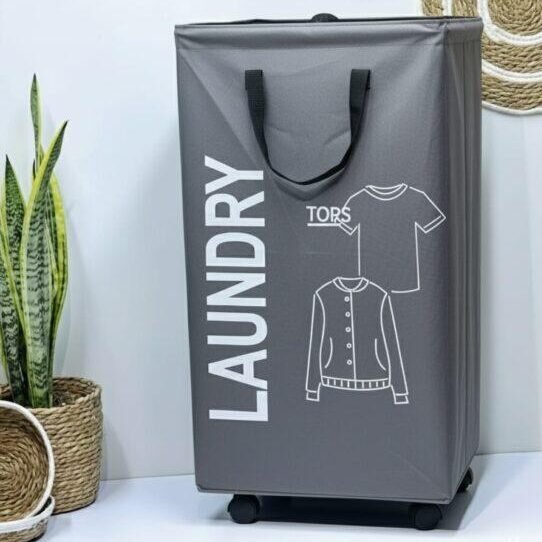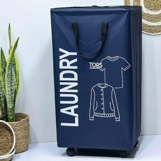 مصنوعة من قماش مضاد للماء والغبار يحمي الملابس من الرطوبة والعفن، وتأتي بتصميم عصري مع كلمة LAUNDRY المطبوعة بوضوح ورسومات لطيفة للملابس.